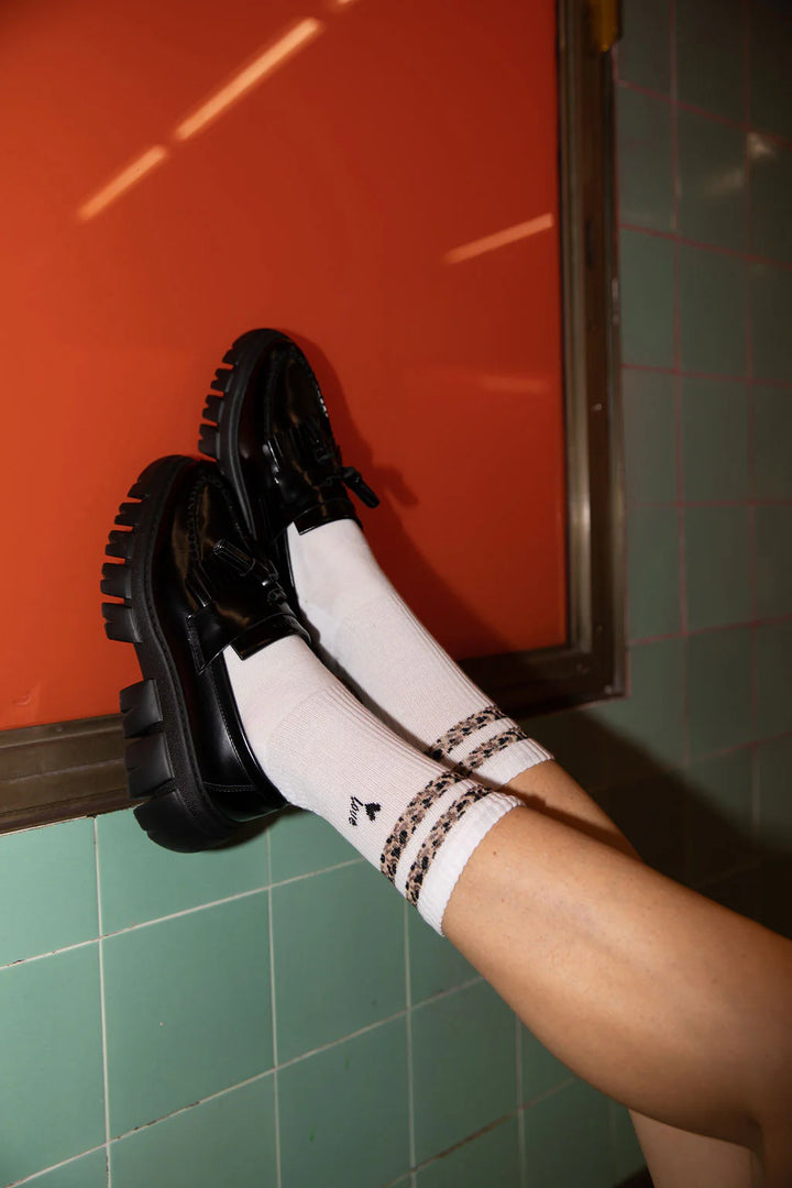 Kuschelig-weiche Baumwollsocken in weiss mit Vollplüschsohle im eleganten, zeitlosen Leo Design.