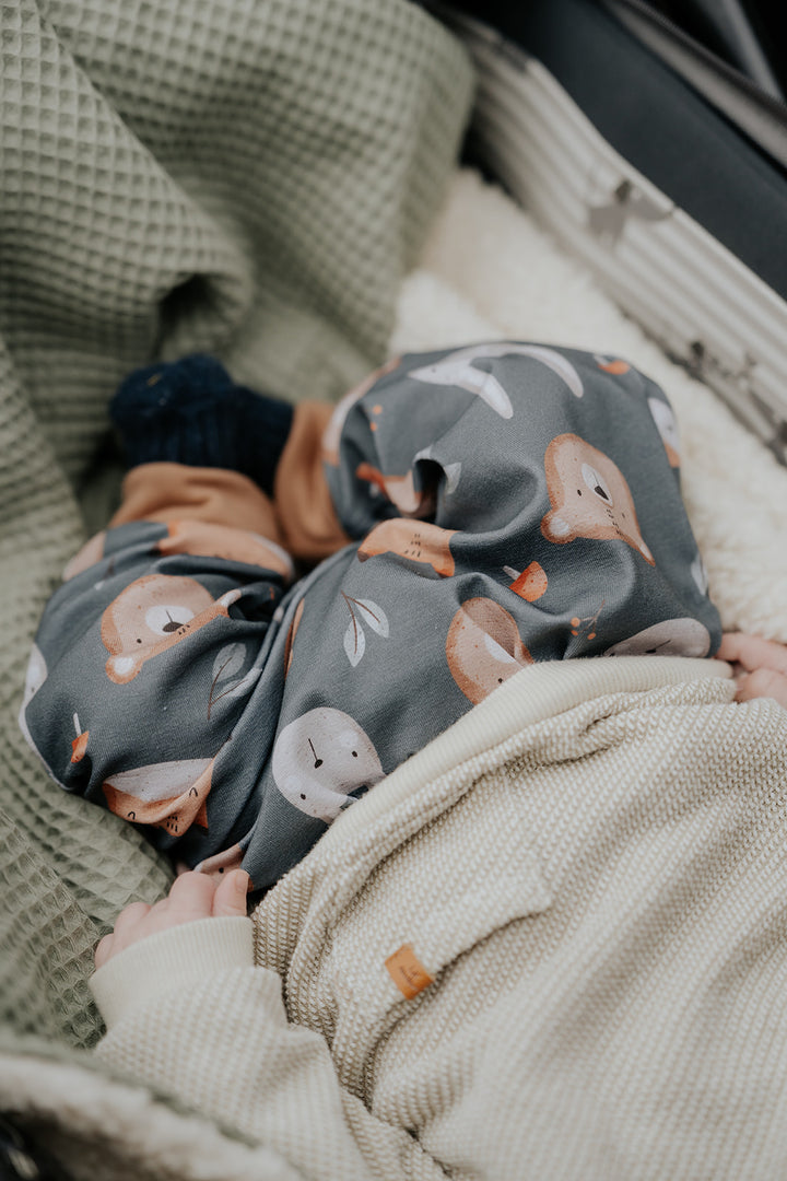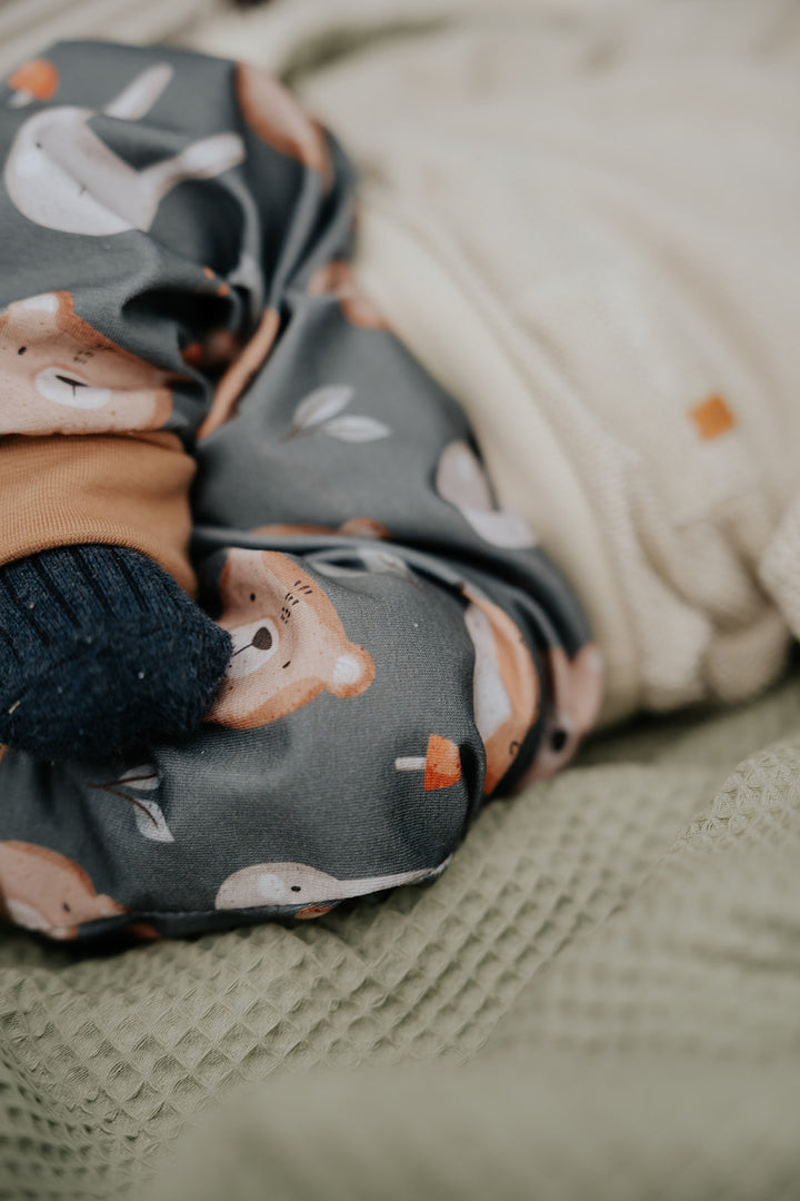 Das süße Waldtier-Motiv macht die Hose zu einem echten Hingucker und sorgt für einen liebevollen, natürlichen Look. Dank der dehnbaren Bündchen an Bauch und Beinen wächst die Hose über mehrere Größen mit und kann lange getragen werden.