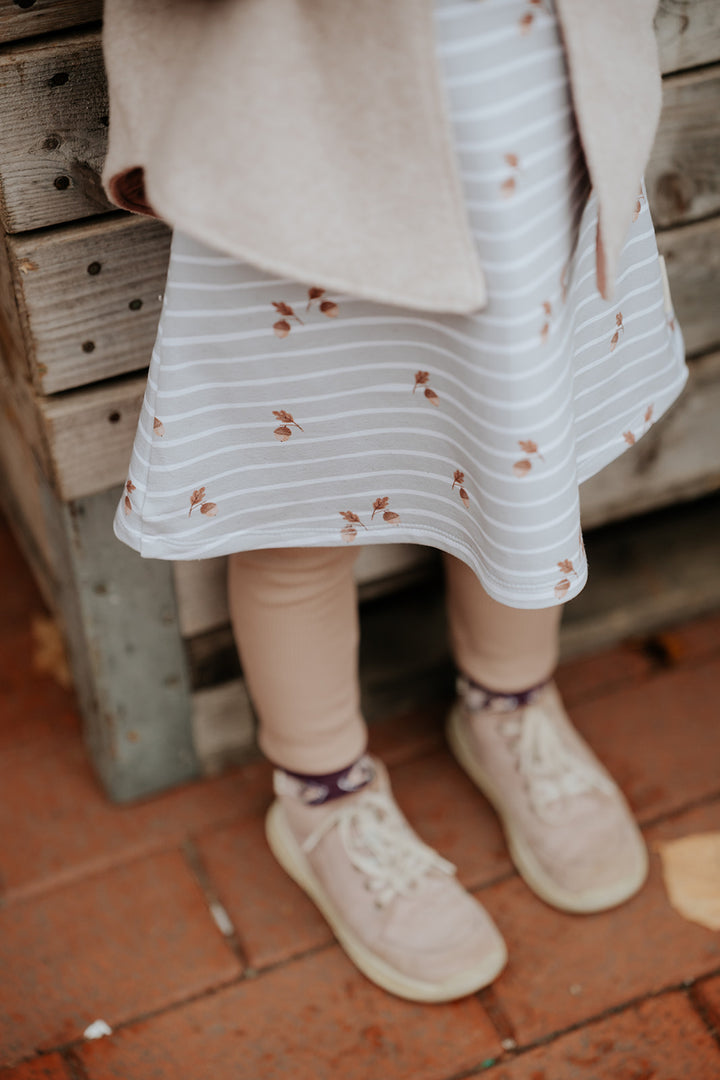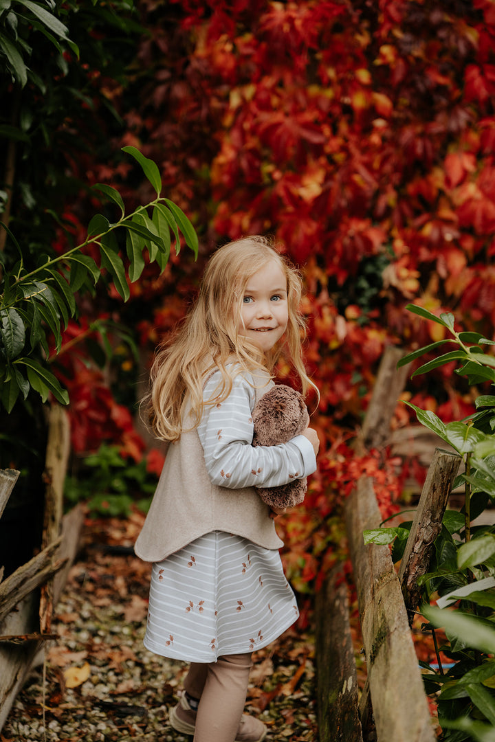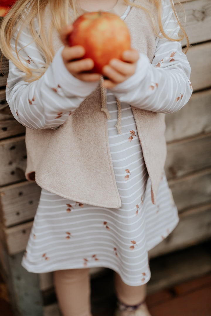 Dieses zauberhafte Sweatkleid vereint Komfort, Verspieltheit und liebevolle Handarbeit. Der sanfte Mintton wirkt frisch und modern, während feine Streifen dem Kleid einen zeitlosen Look verleihen. Kleine Eichel-Details setzen niedliche Akzente und machen das Design besonders charmant – ideal für kleine Naturfreunde.