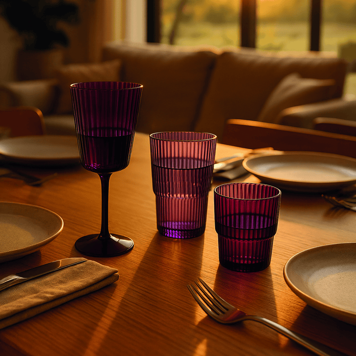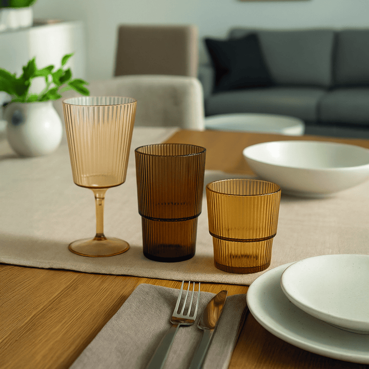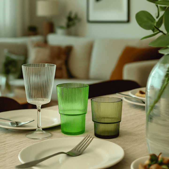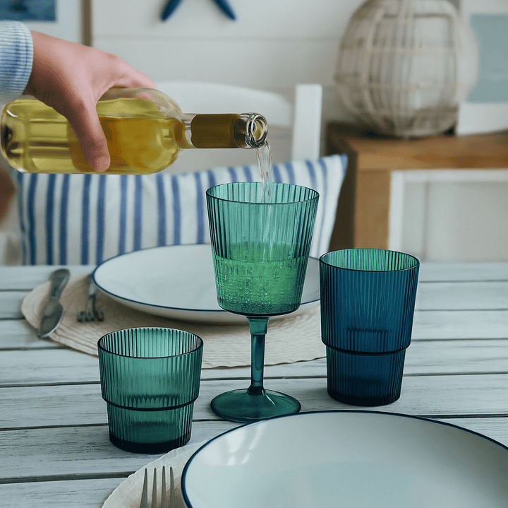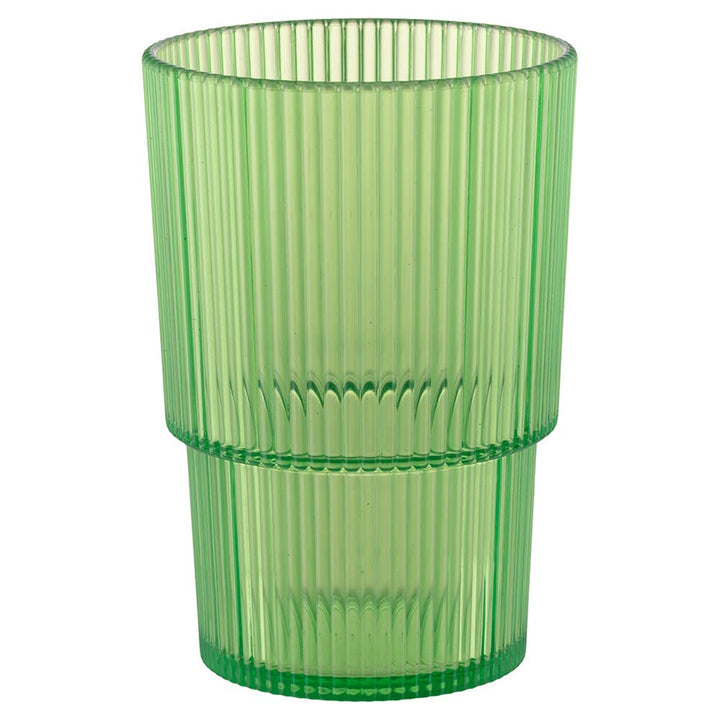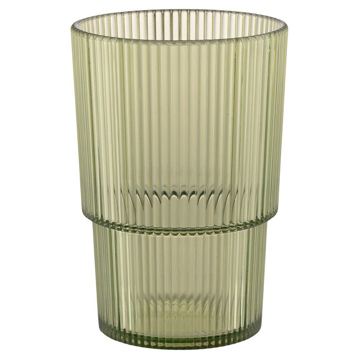 Getränkeglas Shades of Greenery Unico Aus Kunststoff (PS) Kapazität: 420 ml Stapelbar Erhabenes Dekor mit vertikalen Streifen Maße: Ø 9 x h. 13 cm Handwäsche Nicht mikrowellengeeignet Erhältlich in 3 verschiedenen Grüntönen